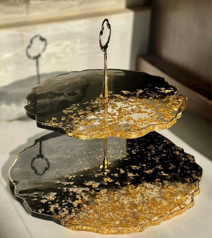This handcrafted two-tier resin stand is designed to bring luxury and elegance to your home decor. Featuring a glossy black finish blended with rich gold foil accents, each tray is hand-poured and polished to create a unique, high-end artistic look. The scalloped edges and premium metal hardware complete the sophisticated appearance, making it perfect for serving desserts, chocolates, dates, or displaying jewelry and decor items.